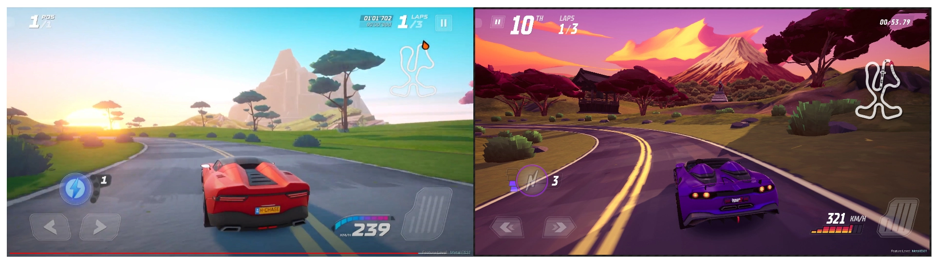 In Horizon Chase 2, we use camera angles and verticality to add or remove challenges in the track. For instance, you can see during Hitachi that there will be some Blue Coins to be collected in the middle of the flower field, even if it’s not exactly clear how the track will be shown to you. That small downhill glimpse of your next path helps the player to understand what’s important about that stage and drives them in the right direction when the moment comes.